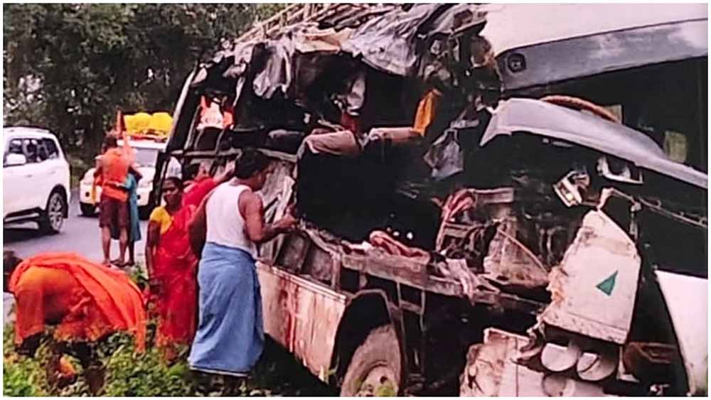 देवघर में भीषण बस हादसा: चालक को आई झपकी, टकराने के बाद ईंटों के ढेर में समाई बस