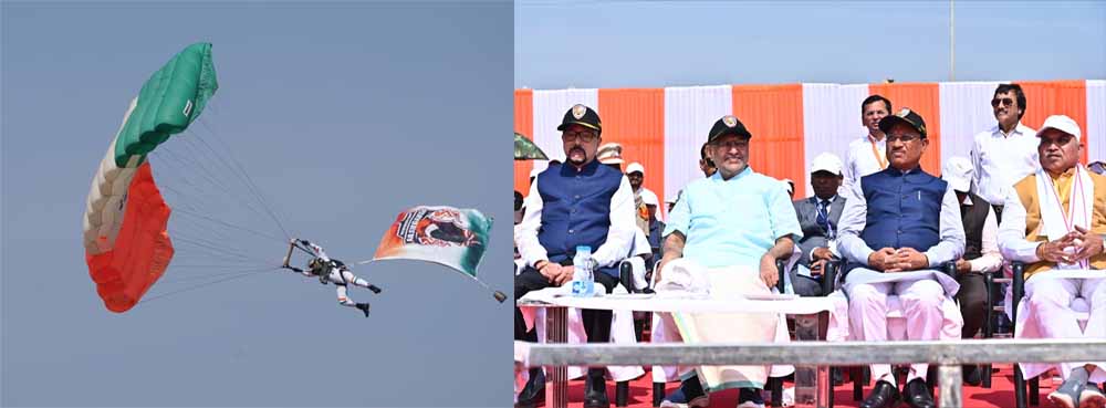 वायु सेना के जाबांज फाइटर पायलटों ने आसमान में दिल की आकृति बनाकर 25वें राज्योत्सव की शुभकामनाएं दीं। उन्होंने तिरंगे के तीन रंगों से डीएनए की आकृति बनाकर तिरंगे के प्रति अपना सम्मान प्रस्तुत किया। उन्होंने 360° में फाइटर जेट उड़ाते हुए उल्टा जेट भी उड़ाया। तेजस और युवाओं को समर्पित अंग्रेजी अक्षर 'वाई' की आकृति बनाने के साथ ही कई करतब दिखाए। टीम का प्रदर्शन केवल मनोरंजन नहीं, बल्कि युवाओं में देशप्रेम, साहस और भारतीय सशस्त्र बलों में सेवा की प्रेरणा जगाने का संदेश भी देता है।