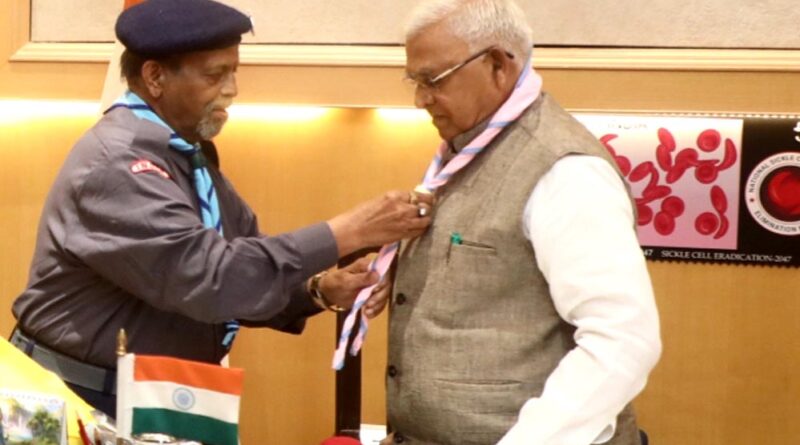 राज्यपाल पटेल को भारत स्काउट्स एवं गाइड्स का बैज और स्कार्फ पहनाया गया