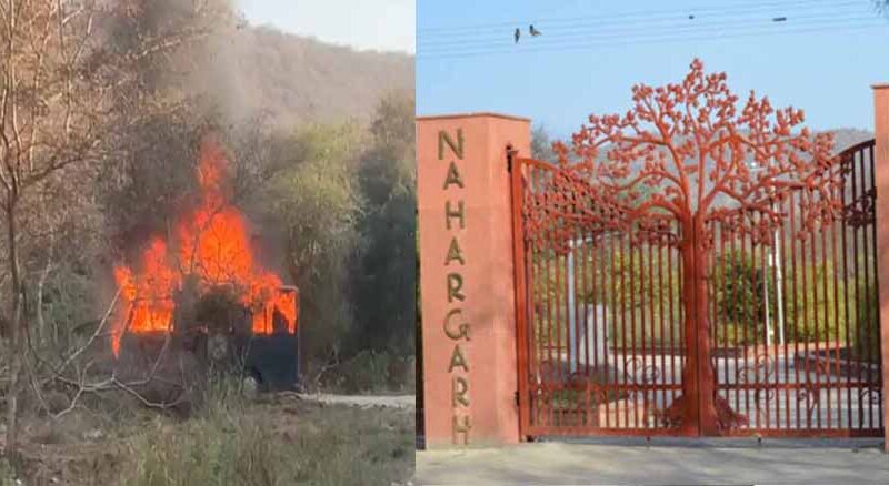 सफारी बस में लगी आग, नाहरगढ़ पार्क में लॉयन्स के बीच बची जान