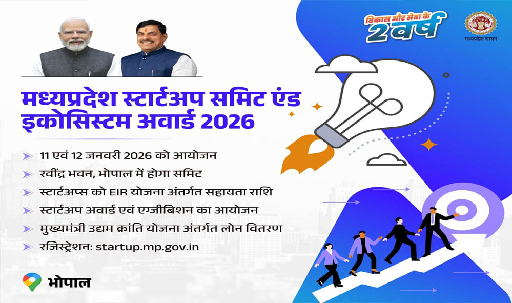 मुख्यमंत्री डॉ. मोहन यादव के ‘विकसित एम.पी. @2047’विज़न को सकारात्मक गति देने और अधिक सुदृढ़ करने के साथ ही स्टार्ट-अप इको-सिस्टम को अगले स्तर तक ले जाने के उद्देश्य से 11 एवं 12 जनवरी 2026 को रवींद्र भवन, भोपाल में मध्यप्रदेश स्टार्ट-अप समिट 2026 का आयोजन होने जा रहा है। सोमवार 12 जनवरी को मुख्यमंत्री डॉ. यादव इसमें सहभागिता करेंगे। समिट में राज्य एवं देश भर से स्टार्ट-अप्स, निवेशक, इनक्यूबेटर्स, उद्योग प्रतिनिधि, शैक्षणिक संस्थान एवं अन्य हितधारक सहभागिता करेंगे। यह समिट स्टार्ट-अप्स को निवेश, नेटवर्किंग, नीति संवाद एवं नवाचार प्रदर्शन का एक सशक्त मंच प्रदान करेगी।