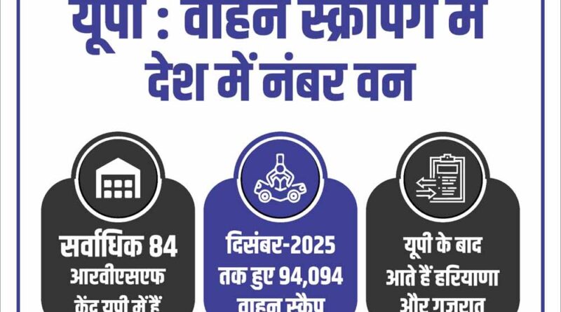 प्रदूषण मुक्ति और पर्यावरण संरक्षण की दिशा में उत्तर प्रदेश ने एक महत्वपूर्ण उपलब्धि हासिल की है। वाहन स्क्रैपिंग में यूपी देश का नंबर एक राज्य है। भारत सरकार के सड़क परिवहन और हाइवे मंत्रालय के डैशबोर्ड के आंकड़ों के अनुसार राज्य में दिंसबर 2025 तक लगभग 94,094 वाहन स्क्रैप किए जा चुके हैं जो देश में स्क्रैप वाहनों की कुल संख्या का लगभग 42 प्रतिशत है। इस मामले में यूपी के बाद हरियाणा, गुजरात, राजस्थान और महाराष्ट्र का नंबर आता है। पुराने वाहनों की स्क्रैपिंग की नीति न केवल पर्यावरण संरक्षण में सहायक है, बल्कि आधुनिक, सुरक्षित और कम उत्सर्जन वाले वाहनों को बढ़ावा देने में भी महत्वपूर्ण भूमिका निभा रही है।