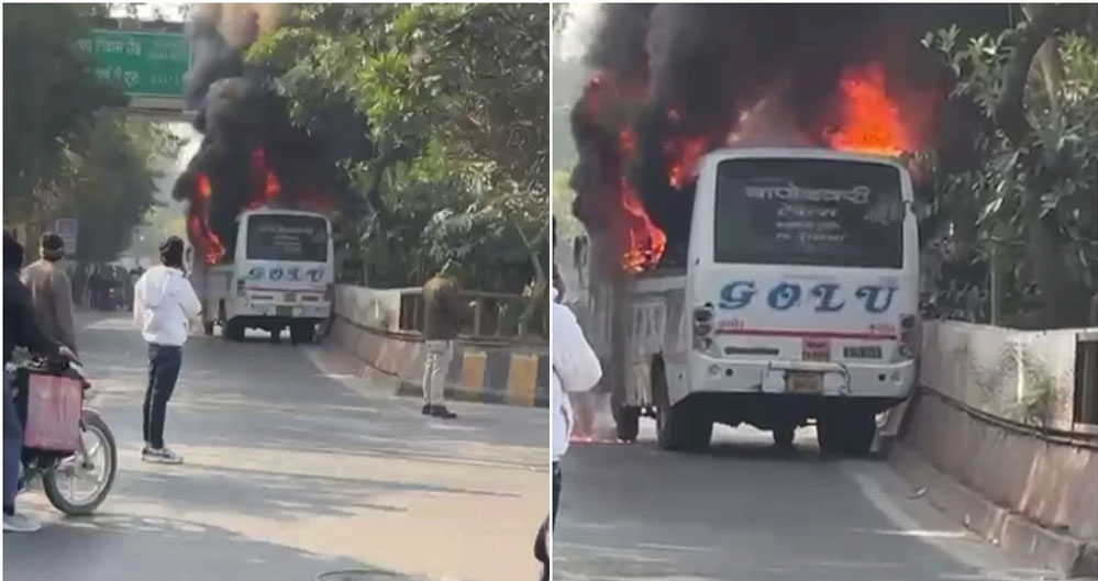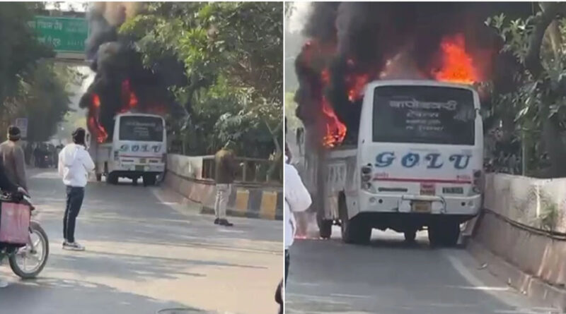 टक्कर के बाद आग की भयंकर लपटों में घिरी शुक्ला ब्रदर्स बस, इंदौर में यात्रियों ने बचाई जान