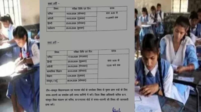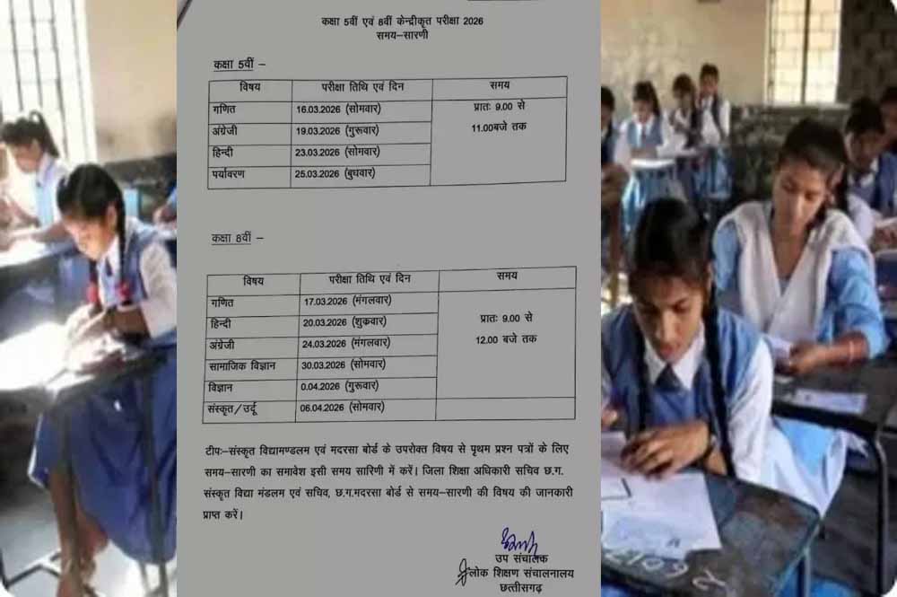 छत्तीसगढ़ लोक शिक्षा संचालनालय ने कक्षा 5वीं और 8वीं की वार्षिक परीक्षा की समय सारिणी जारी कर दी है. इस बार परीक्षाएं बोर्ड पैटर्न में आयोजित की जाएगी. जारी एग्जाम शेड्यूल में 5वीं कक्षा की 16 मार्च और 8वीं कक्षा की 17 मार्च से वार्षिक परीक्षा (Final Examination Schedule) आयोजित होंगी.