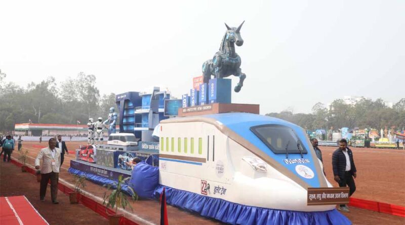 झांकी में आगे आधुनिक इलेक्ट्रिक परिवहन, रोबोटिक्स एवं ऑटोमेशन, मेगा इनक्यूबेशन/इनोवेशन सेंटर, हेल्थ-टेक, शिक्षा एवं कौशल विकास में एआर/वीआर तकनीक तथा स्टार्टअप्स की विकास यात्रा को IDEA → PROTOTYPE → GTM (Go-To-Market) → SCALE चरणों के माध्यम से प्रभावी रूप से प्रदर्शित किया गया। अंतिम दृश्य में आधुनिक बुलेट ट्रेन के माध्यम से तेज, सतत एवं भविष्य उन्मुख औद्योगिक विकास का प्रतीकात्मक चित्रण किया गया।