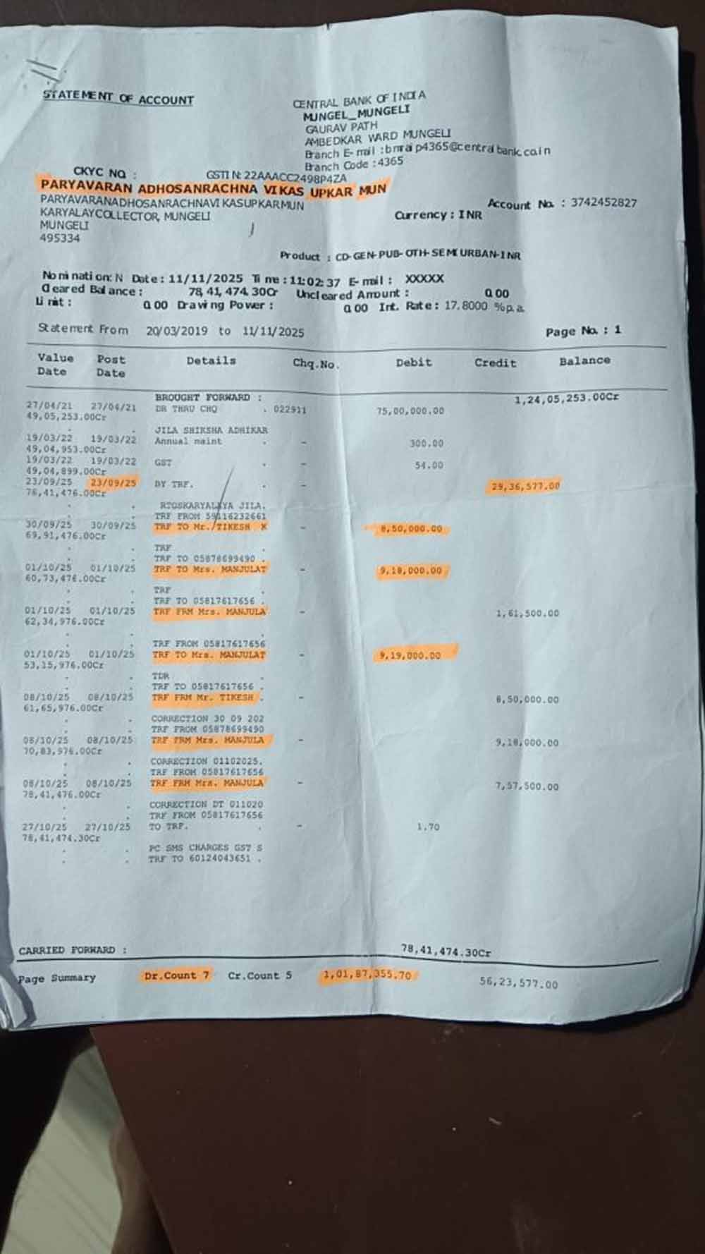 छत्तीसगढ़ के मुंगेली जिले में सरकारी खजाने में सेंधमारी का एक बेहद गंभीर मामला सामने आया है. कलेक्ट्रेट के पर्यावरण अधोसंरचना विकास उपकर खाते से लगभग 26.87 लाख रुपये की हेराफेरी की गई है. इस खुलासे के बाद जिला प्रशासन और बैंक प्रबंधन के बीच हड़कंप मच गया है.